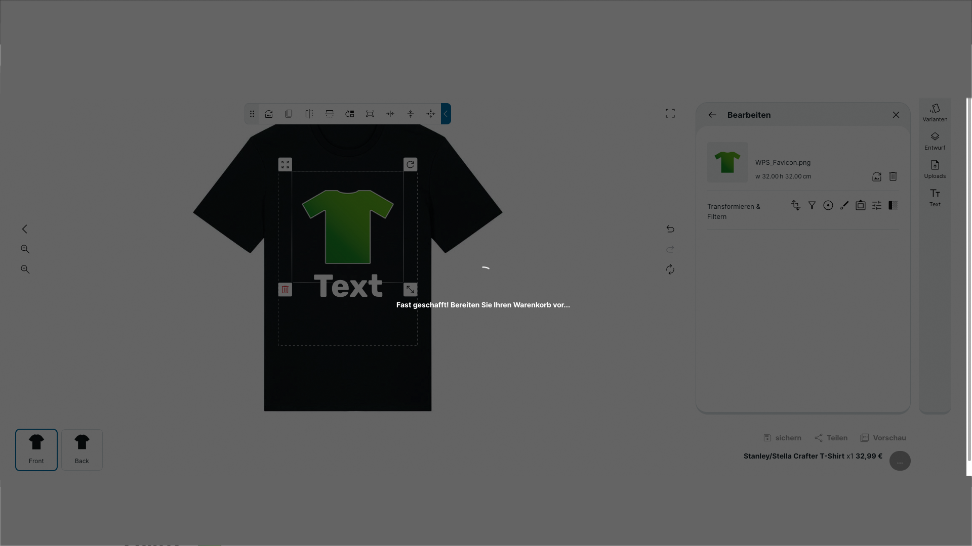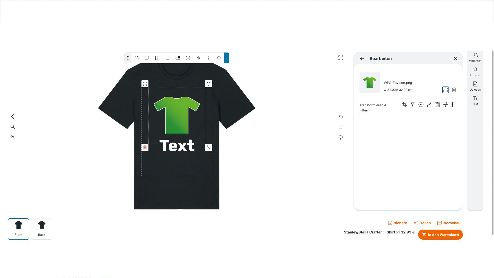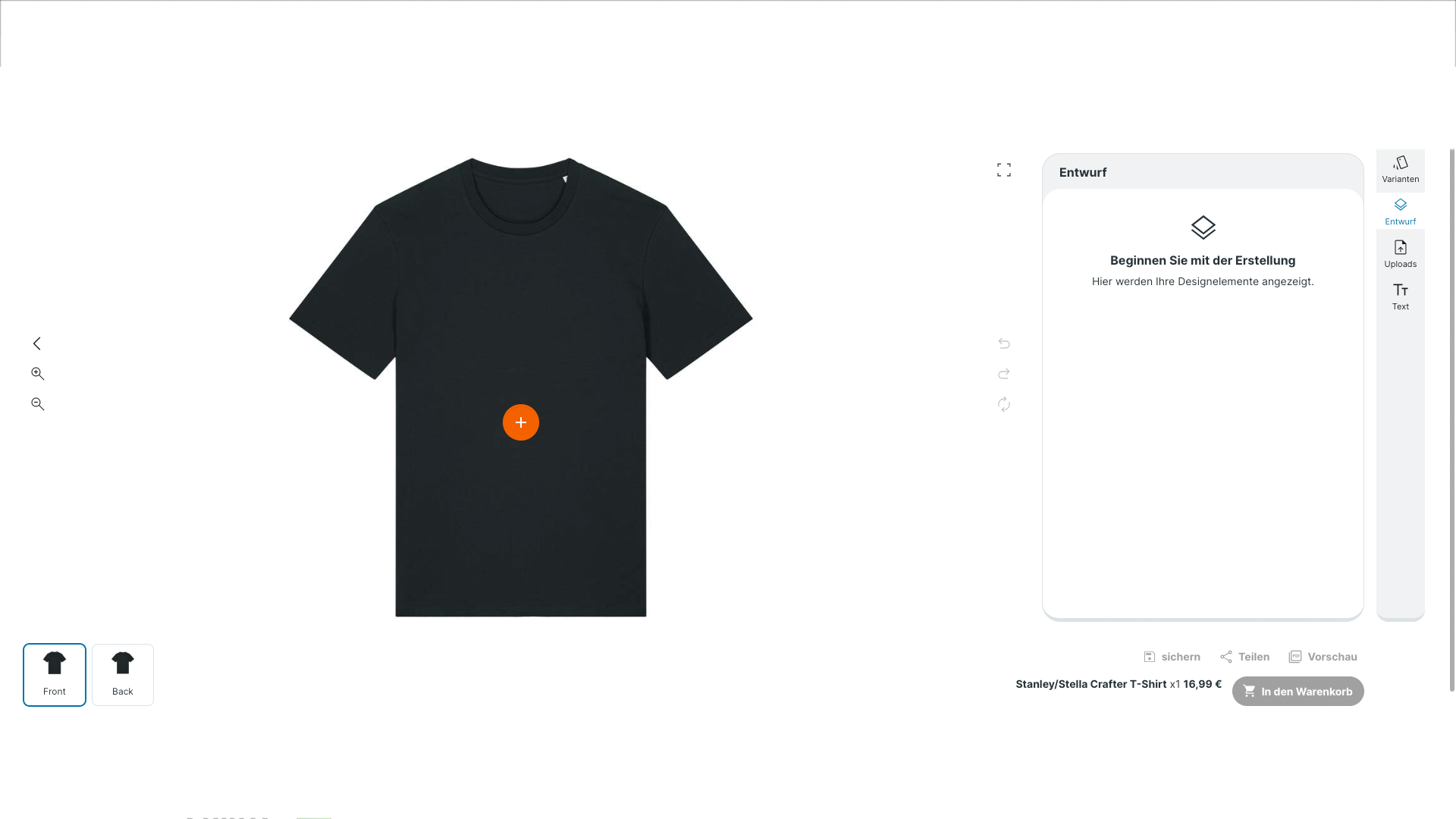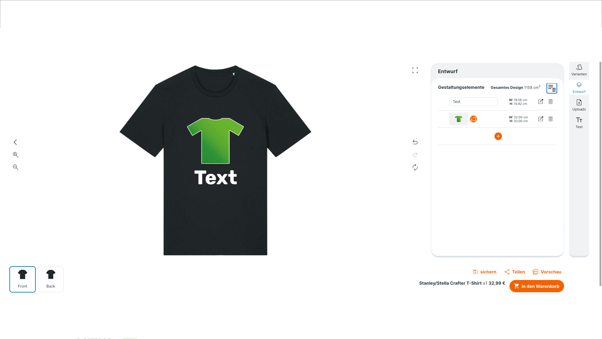 Sobald dein Design fertig ist, klickst du unten rechts auf „Sichern“ oder „In den Warenkorb“.
