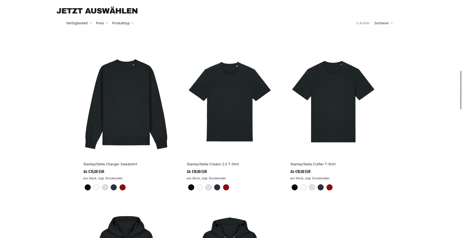 Zu Beginn wählst du den Artikel, den du gestalten möchtest – zum Beispiel ein T-Shirt, einen Hoodie oder ein Sweatshirt.